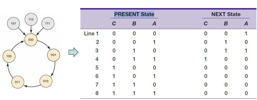 3. state transition diagram을 바탕으로 모든 present state와 next state를 열거하는 표를 작성한다.