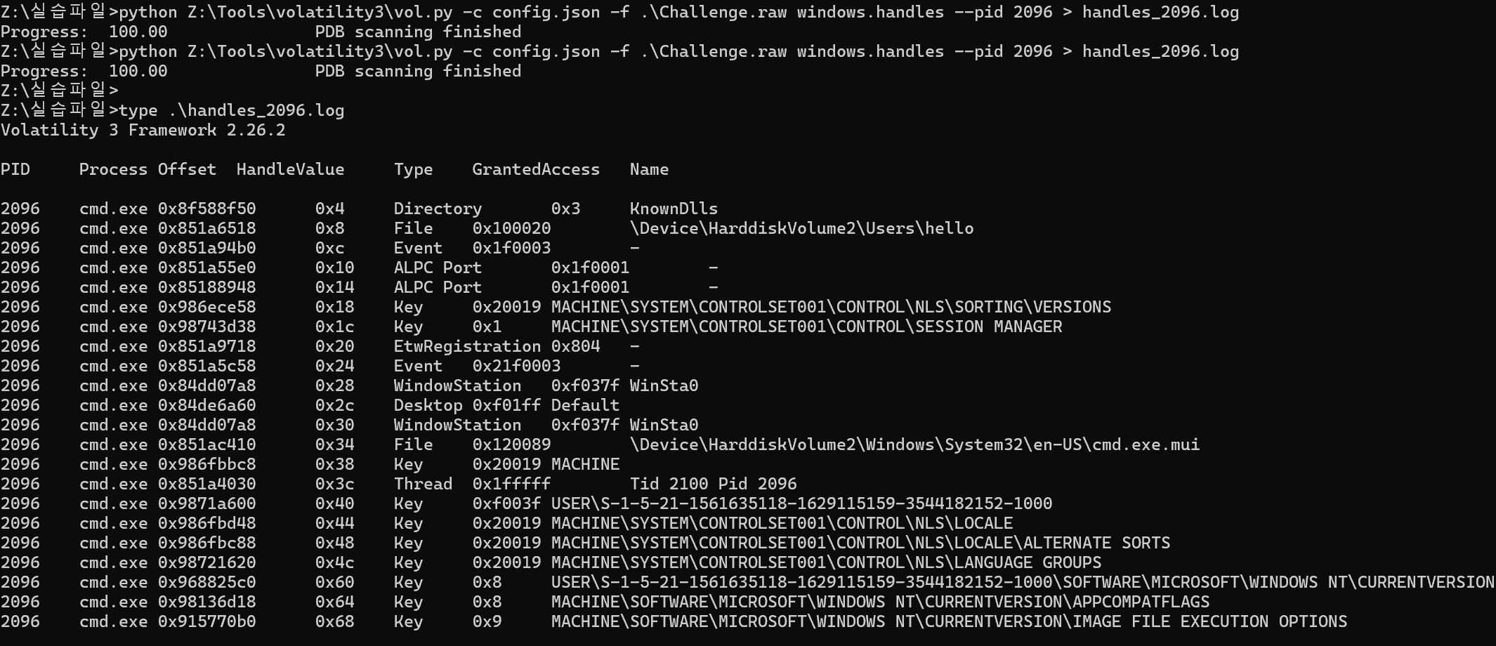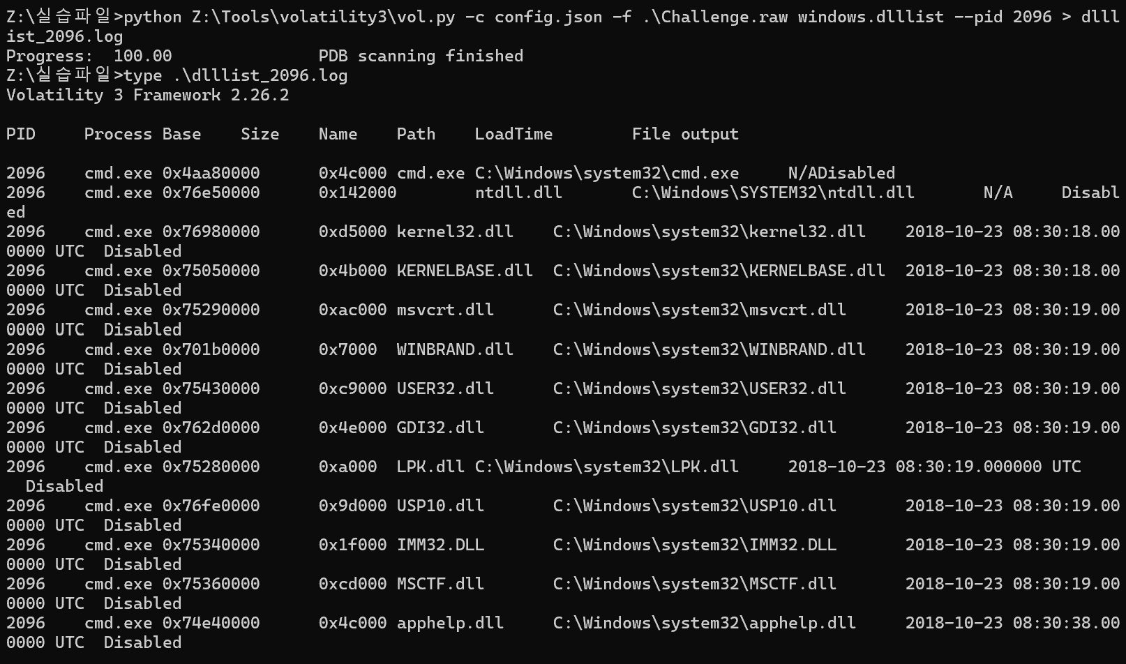 python Z:\Tools\volatility3\vol.py -c config.json -f .\Challenge.raw windows.dlllist --pid 2096 > dlllist_2096.log