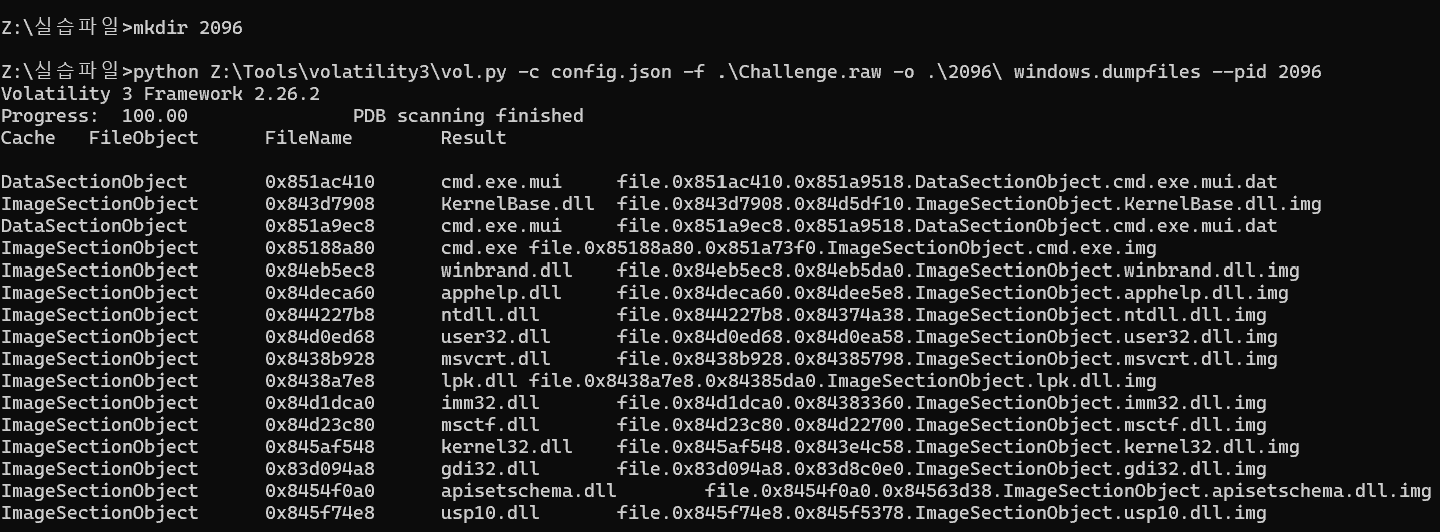 python Z:\Tools\volatility3\vol.py -c config.json -f .\Challenge.raw -o .\2096\ windows.dumpfiles --pid 2096